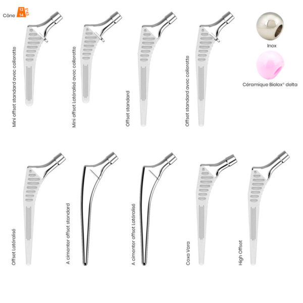 Sono disponibili complessivamente 9 steli, di cui due steli corti, degli offset standard e lateralizzati (6 mm di lateralizzazione rispetto agli steli standard), e due steli da cementare.