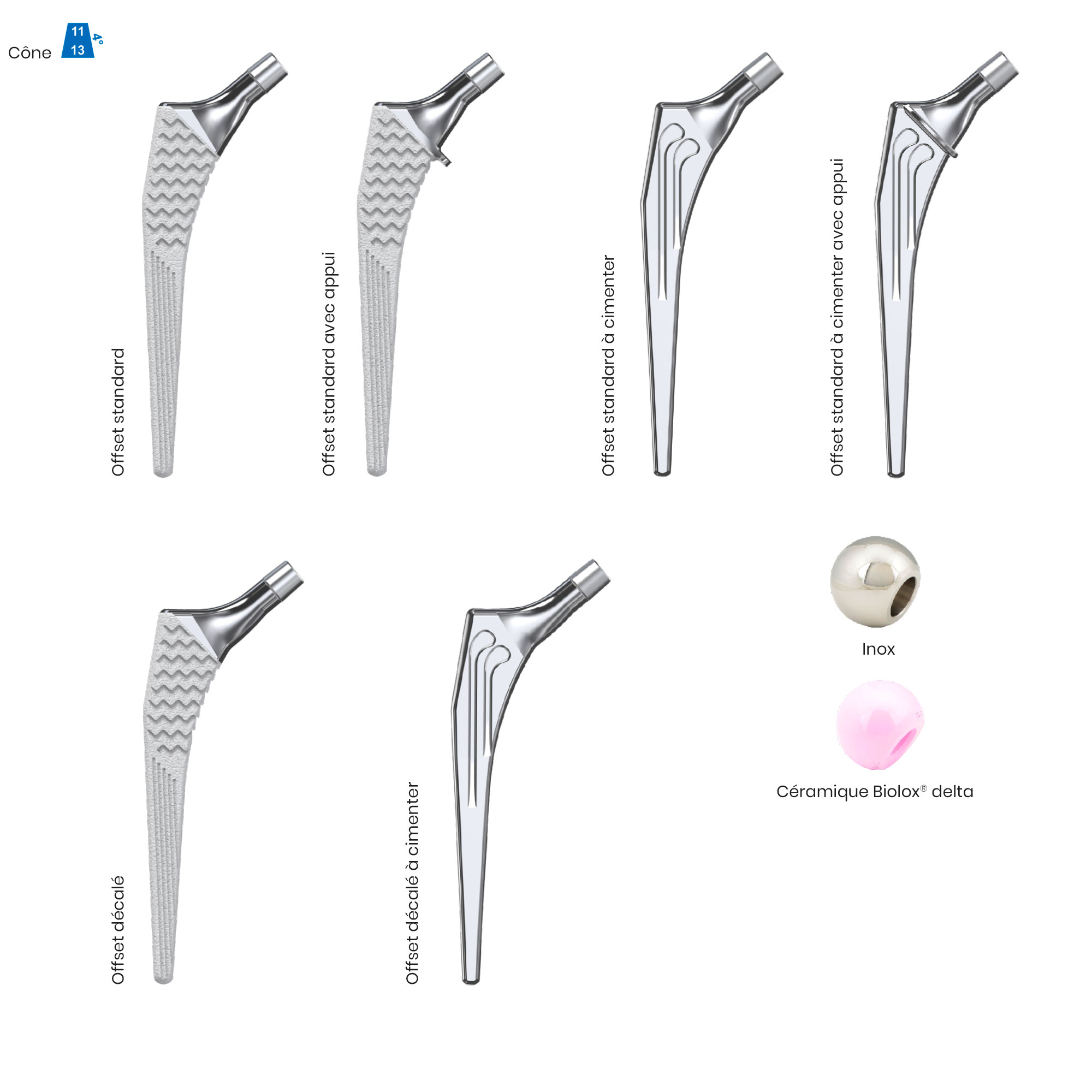 La gamma Libra® è composta da steli femorali quadrangolari di prima chirurgia o di revisione, detti autobloccanti. Questi steli hanno un cono 11/13 (4°).